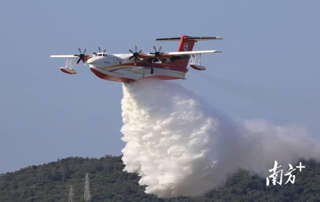 大型水陆两栖飞机AG600“鲲龙”在进行汲水投水演练。