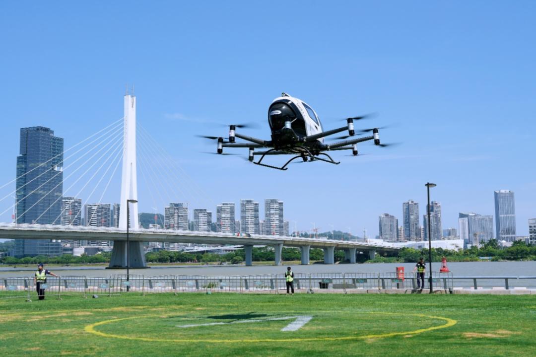 南沙灵山岛水舞广场,一架eVTOL无人驾驶电动垂直起降飞行器EH216-S正在起飞。