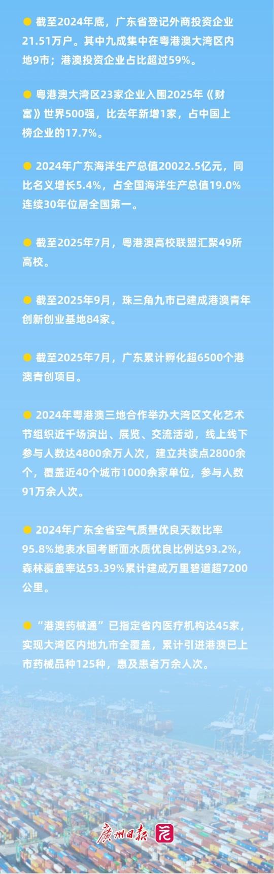 社会保障与医疗服务的跨境融合,更是让大湾区居民享受到实实在在的便利。目前,“湾区社保通”服务网点已覆盖香港14个行政分区和澳门全部行政分区。2024年11月,“大湾区跨境直通救护车试行计划”启动,采用粤港两地牌照救护车执行点对点转运服务,实现跨境患者高效转运。“长者医疗券大湾区试点计划”让合资格香港长者可在广东省内21家指定医疗机构直接使用医疗券,目前已实现大湾区内地九市全覆盖。此外,广东携手港澳探索养老服务“湾区模式”,全省共有港澳服务提供者开设或运营的养老服务机构12家,全省养老服务机构收住港澳籍老年人1600多人。(文/广州日报全媒体记者伍仞、何颖思、林欣潼)