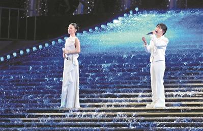 开幕式上,实力唱将周深与单依纯唱响《天海一心》,强强联手,宛如天籁。周深清澈通透的声线如“一滴水”唤醒个体共鸣,单依纯温润细腻的嗓音似“一汪水”承载家国情怀,两人声线共振,让歌曲“小切口见大格局”的艺术魅力尽显。