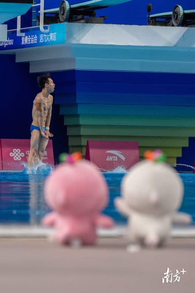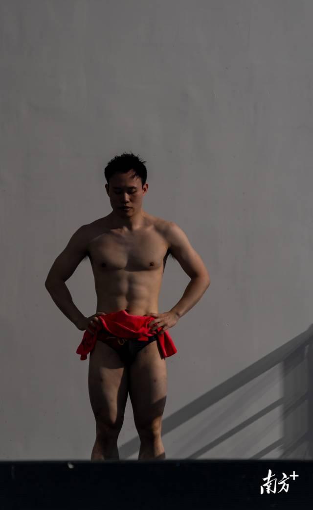 11月3日,广东队老将谢思埸在场边准备男子团体双人3米板的第二跳。