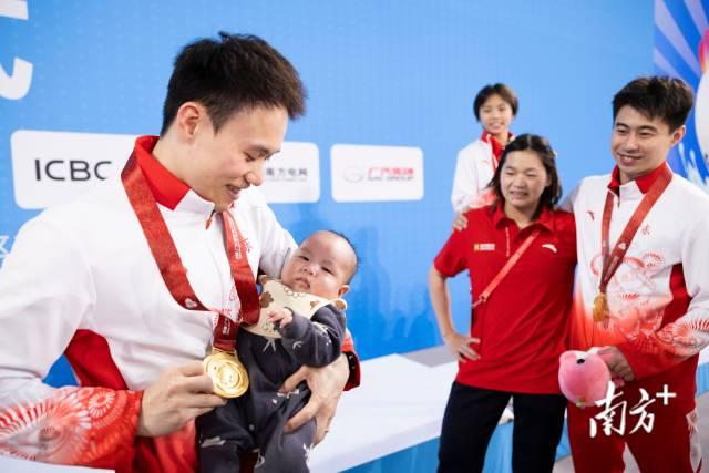 11月4日晚,十五运会男子团体3米跳板广东夺冠后,广东名将谢思埸将金牌轻轻送到自己尚在襁褓中的孩子手里。