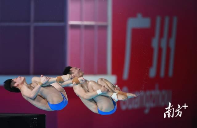 11月3日,广东队陈艾森、朱子锋组合在男子团体10米跳台第二跳跳出93.24高分。