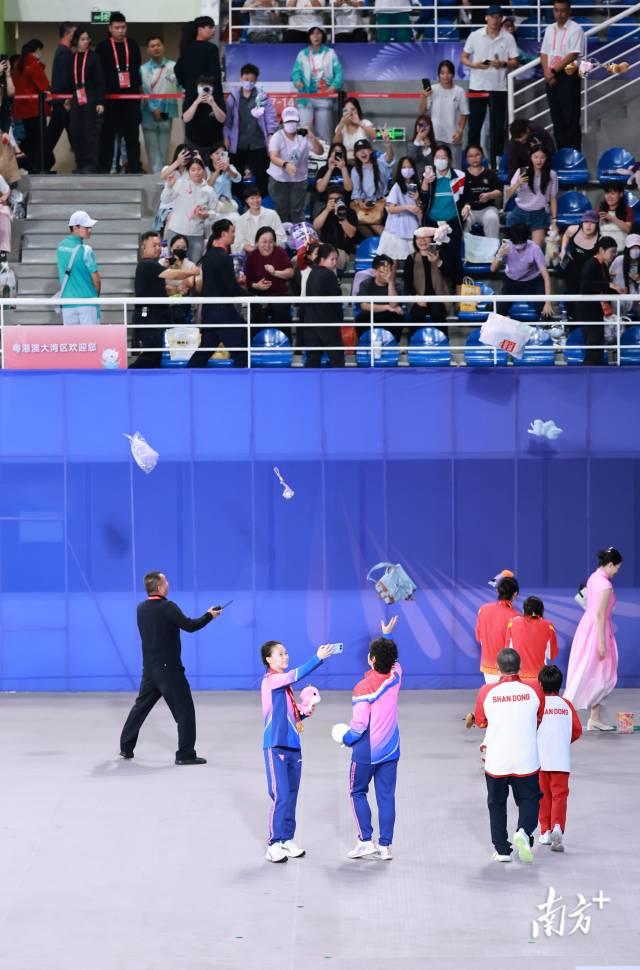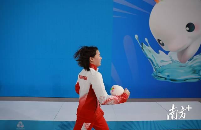 11月10日晚,十五运会跳水女子10米台决赛,上海队选手陈芋汐夺冠。颁奖仪式后,她特意走向观众席,与等候多时的粉丝互动、合影留念。