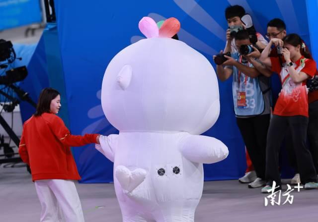 11月10日,全红婵与全运会吉祥物互动拍照。