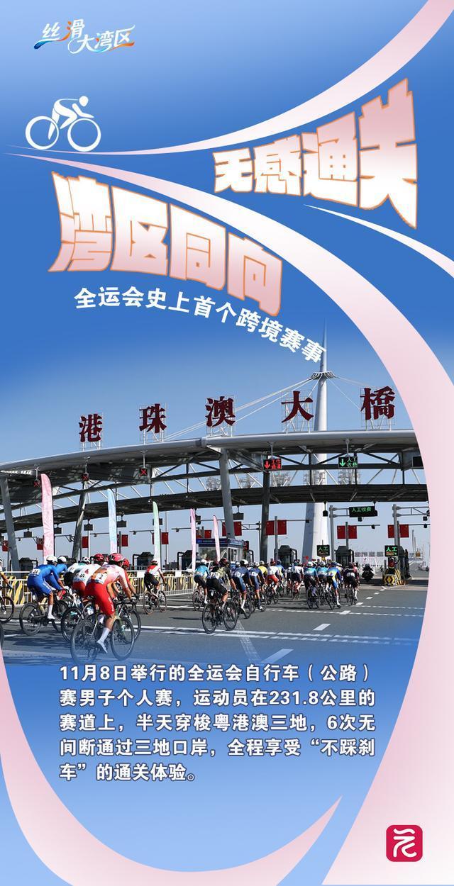 11月8日圆满完成的自行车(公路)赛男子个人赛,以港珠澳大桥为纽带,路线跨越珠海、澳门和香港;