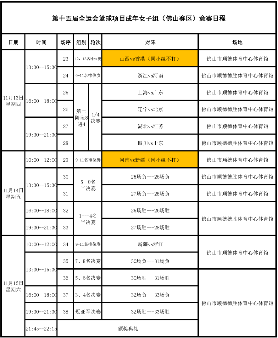 11月12日,记者从佛山市顺德区方面获悉,根据篮球项目(女子成年组)“同小组不打”的竞赛规则,11月13日13:30-15:30在佛山市顺德体育中心体育馆举行的第十五届全国运动会篮球项目(女子成年组)第23轮次12-13名排位赛(山西VS香港),因比赛队伍为同小组不打比赛轮空,11月14日10:00-12:00在佛山市顺德体育中心体育馆举行的第29轮次9-11名排位赛(河南VS新疆)因比赛队伍为同小组不打比赛轮空。