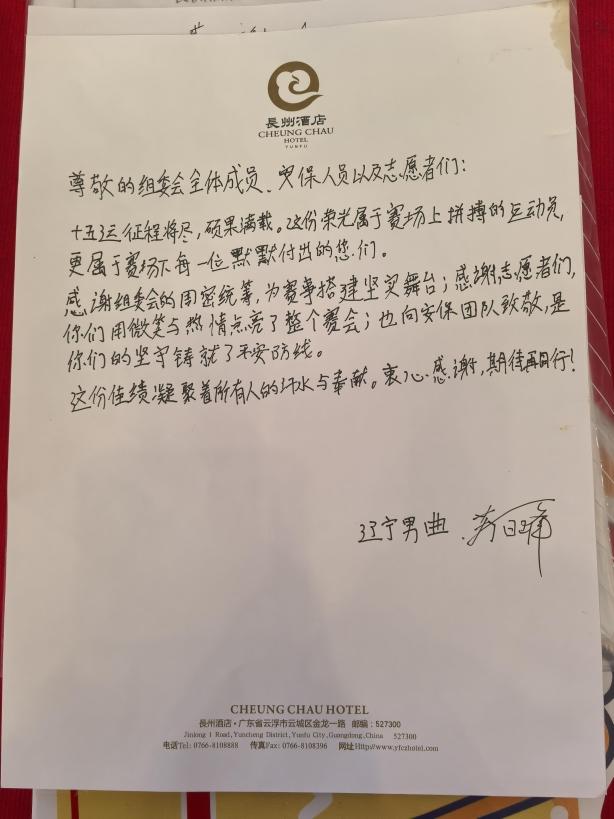 “十五运征程将尽,硕果满载。这份荣光属于赛场上拼搏的运动员,更属于赛场下每一位默默付出的您们……”11月16日,一封来自辽宁男曲的手写信,写给了云浮执委会的全体成员、安保人员和志愿者们的信感人至深,令人动容。