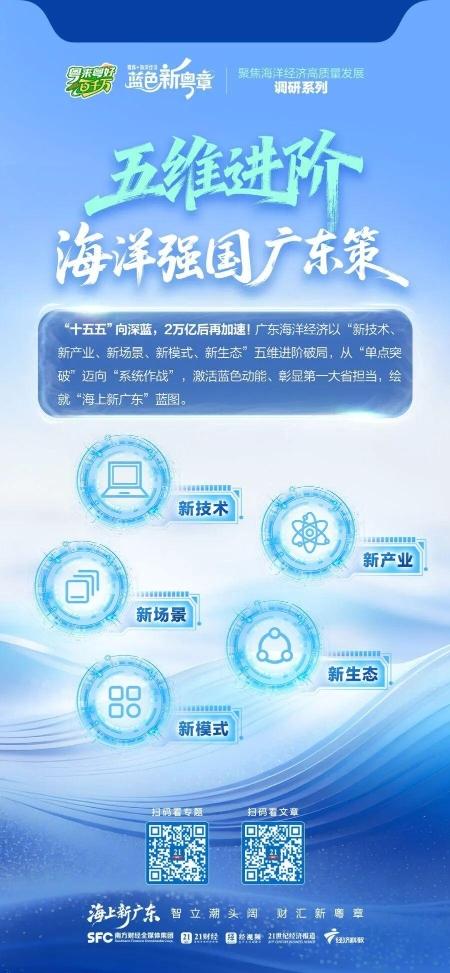 如今,广东海洋经济发展早已跳出“单点突破”的传统模式,以“新技术、新产业、新场景、新模式、新生态”五维路径,下出一盘蓝色新棋局,“海上新广东”的轮廓也愈发清晰。
