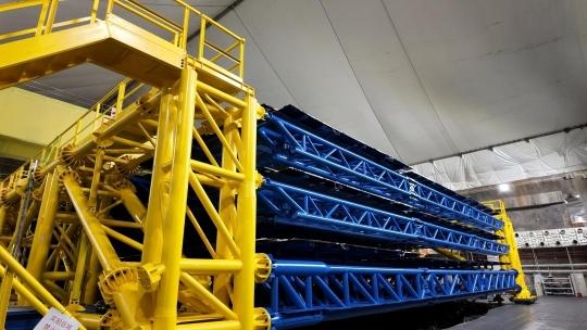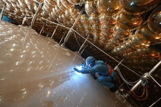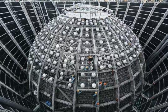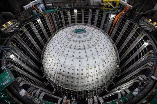 JUNO研发团队历经多年攻关,在高探测效率光电倍增管、超高透明度液体闪烁体、超低本底材料和精密刻度系统等核心领域实现重大突破。JUNO的核心探测器为有效质量达2万吨的液体闪烁体探测器,安置于地下实验大厅44米深的水池中央。直径41.1米的不锈钢网壳作为主支撑结构,承载了包括35.4米直径的有机玻璃球、两万吨液体闪烁体、两万只20英寸光电倍增管、两万五千只3英寸光电倍增管以及前端电子学、电缆、防磁线圈和隔光板等众多关键部件,共同构建起超高灵敏度的中微子探测系统。