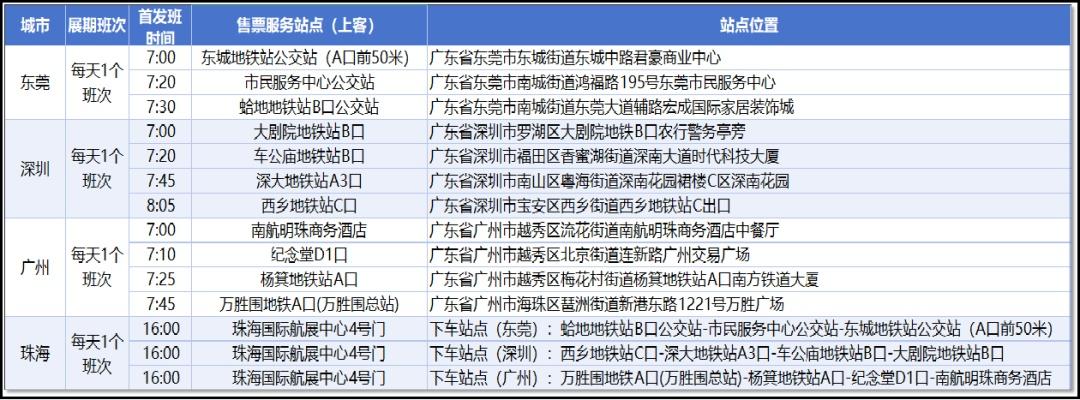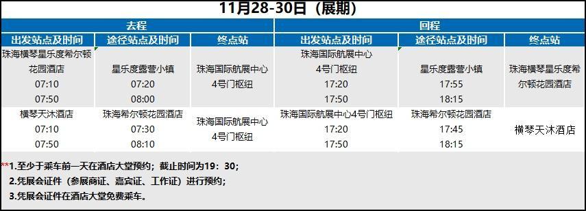 11月27—30日,珠海机场快线新增航展中心4号门停靠点,市内增开拱北、香洲、吉大、前山、横琴、南屏、唐家至航展中心4号门的往返班次,同时新增中山、江门、澳门等跨市往返线路。