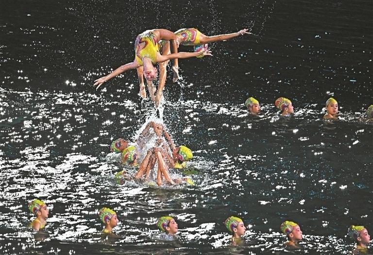 最令人惊叹的是花样游泳表演。少女们跃入实景水域,在梦幻般的水光中舒展身姿,宛若精灵。夜幕下,城市灯火与舞台光影交融,水中动作整齐划一,柔美与力量并存,将体育的艺术之美演绎得淋漓尽致,引发现场阵阵惊呼。