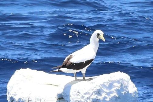 蓝脸鲣鸟全身大部分白色,翅膀后缘、尾巴和初级飞羽黑色,喙黄色,面部具黑色眼罩。主要栖息于热带海洋和岛屿上,大部分时间在海上活动,通常以鱼类、头足类和甲壳类为食。在我国钓鱼岛有繁殖记录,夏候鸟常见于福建和香港海域。调查期间,团队在距离惠州市约120公里和汕头市约100公里的近海海域记录到蓝脸鲣鸟。本次发现将增进对该物种在我国分布区域的认识,也为丰富广东省海洋鸟类资源提供了新的资料。