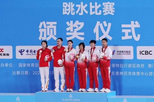 十五运会赛场上,谢思埸、苏炳添、刘虹、刘诗雯等一批久经沙场的广东老将用坚持与热爱诠释了体育精神,他们的坚守与追求鼓舞了整个代表团。谢思埸克服伤病困扰,夺得跳水男团和男双3米跳板2枚金牌;苏炳添领衔广东队出战田径男子4×100米接力决赛,最终以0.03秒之差错过领奖台,完成谢幕演出;38岁的竞走老将刘虹和31岁的搭档王凯华拼到极限最终获得马拉松竞走混合接力第四名;六度征战全运会的刘诗雯携手林高远,“诗和远方”上演精彩逆转,勇夺乒乓球混双金牌;花样游泳“双生花”王柳懿、王芊懿尽显力与美,顺利摘得双人项目金牌;第三次参加全运会的34岁老将李剑鸣稳健发挥,勇夺男子南拳全能冠军;广东马术队在顾兵、黄焯钦、梁锐基等老将带领下获得2金1银3铜。此外,已经征战两届奥运会、一届全运会的跳水“老将”全红婵克服伤病困扰,参加本届全运会2个小项比赛,为广东蝉联跳水女团金牌作出突出贡献。