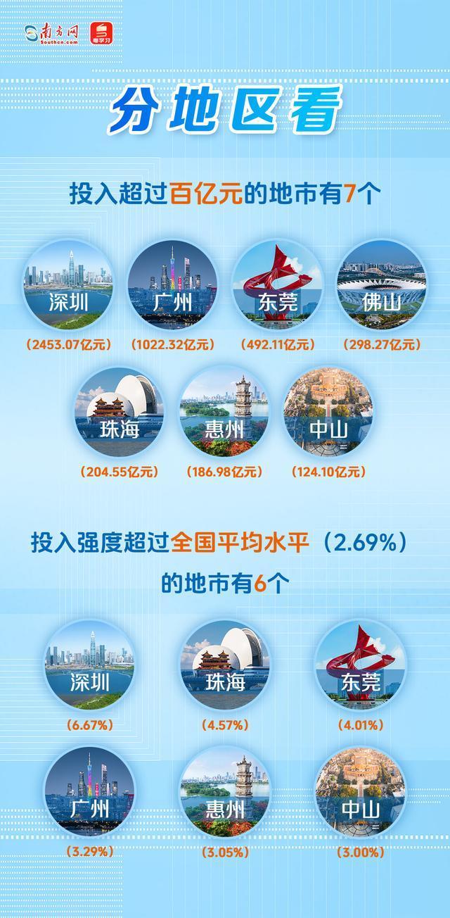 分地区看,广东研究与试验发展(R&D)经费投入超过百亿元的地市有7个,依次为深圳(2453.07亿元)、广州(1022.32亿元)、东莞(492.11亿元)、佛山(298.27亿元)、珠海(204.55亿元)、惠州(186.98亿元)、中山(124.10亿元)。研究与试验发展(R&D)经费投入强度(与地区生产总值之比)超过全国平均水平(2.69%)的地市有6个,依次为深圳(6.67%)、珠海(4.57%)、东莞(4.01%)、广州(3.29%)、惠州(3.05%)、中山(3.00%)。