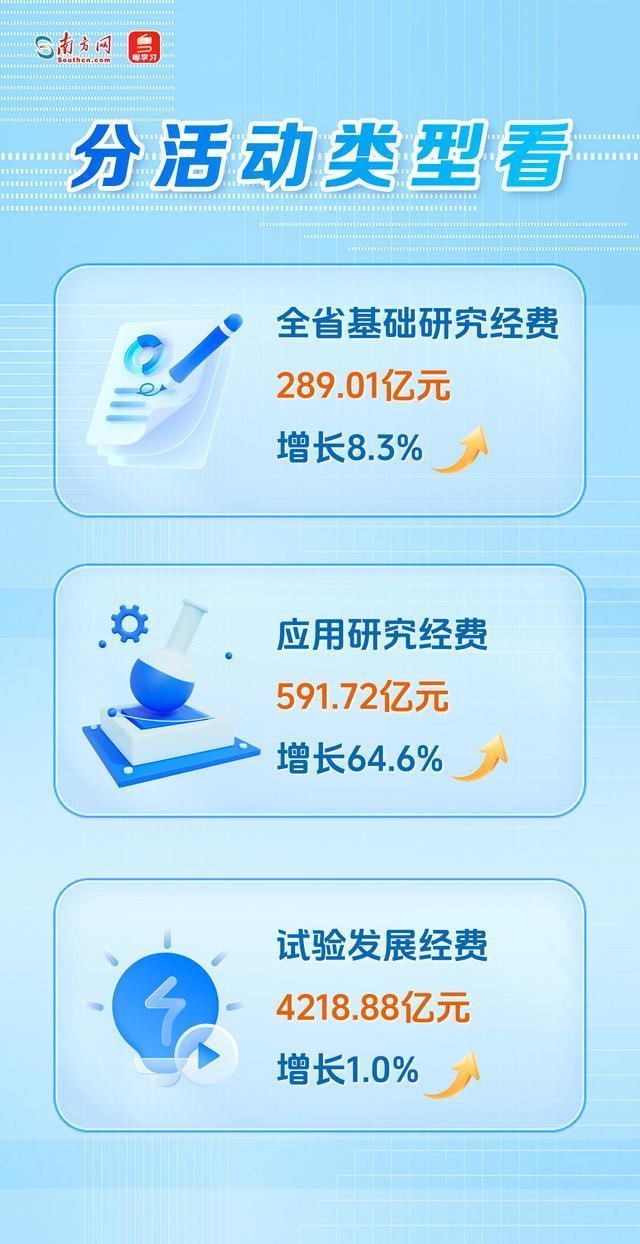 分活动类型看,广东基础研究经费289.01亿元,比上年增长8.3%;应用研究经费591.72亿元,增长64.6%;试验发展经费4218.88亿元,增长1.0%。