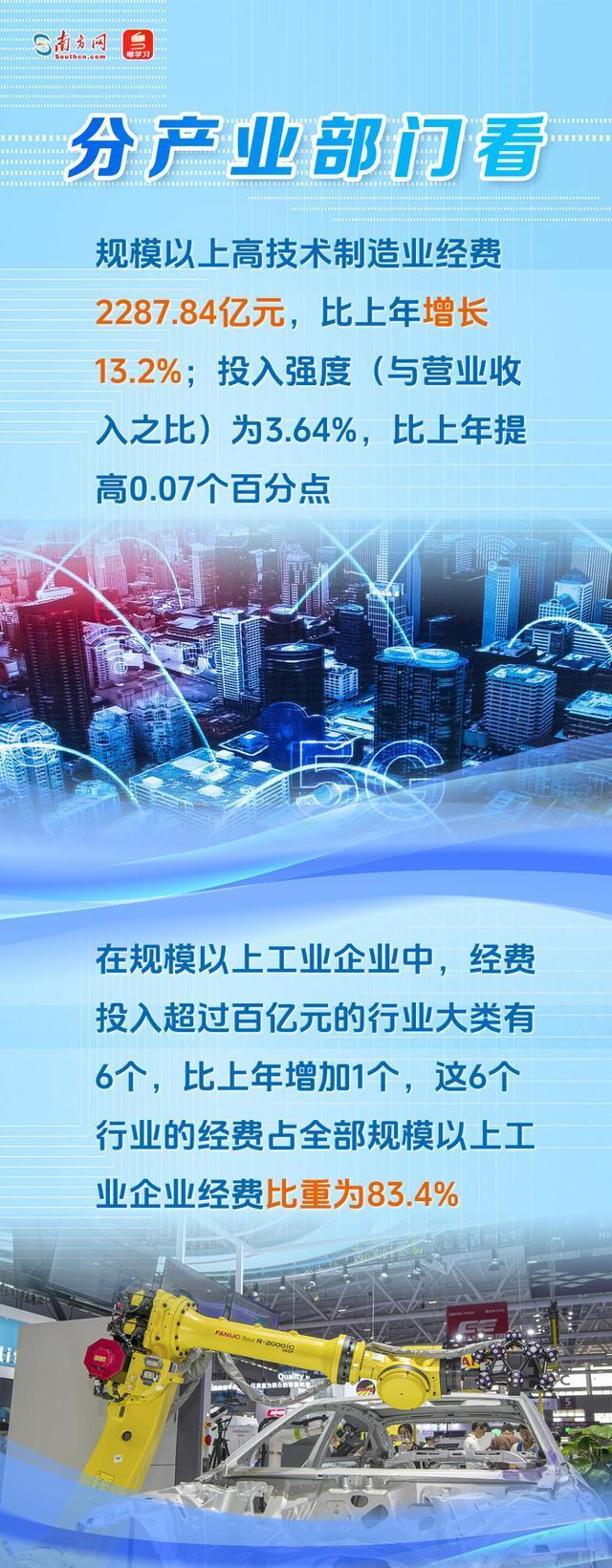 分产业部门看,广东规模以上高技术制造业研究与试验发展(R&D)经费2287.84亿元,比上年增长13.2%;投入强度(与营业收入之比)为3.64%,比上年提高0.07个百分点。在规模以上工业企业中,研究与试验发展(R&D)经费投入超过百亿元的行业大类有6个,比上年增加1个,这6个行业的经费占全部规模以上工业企业研究与试验发展(R&D)经费的比重为83.4%。