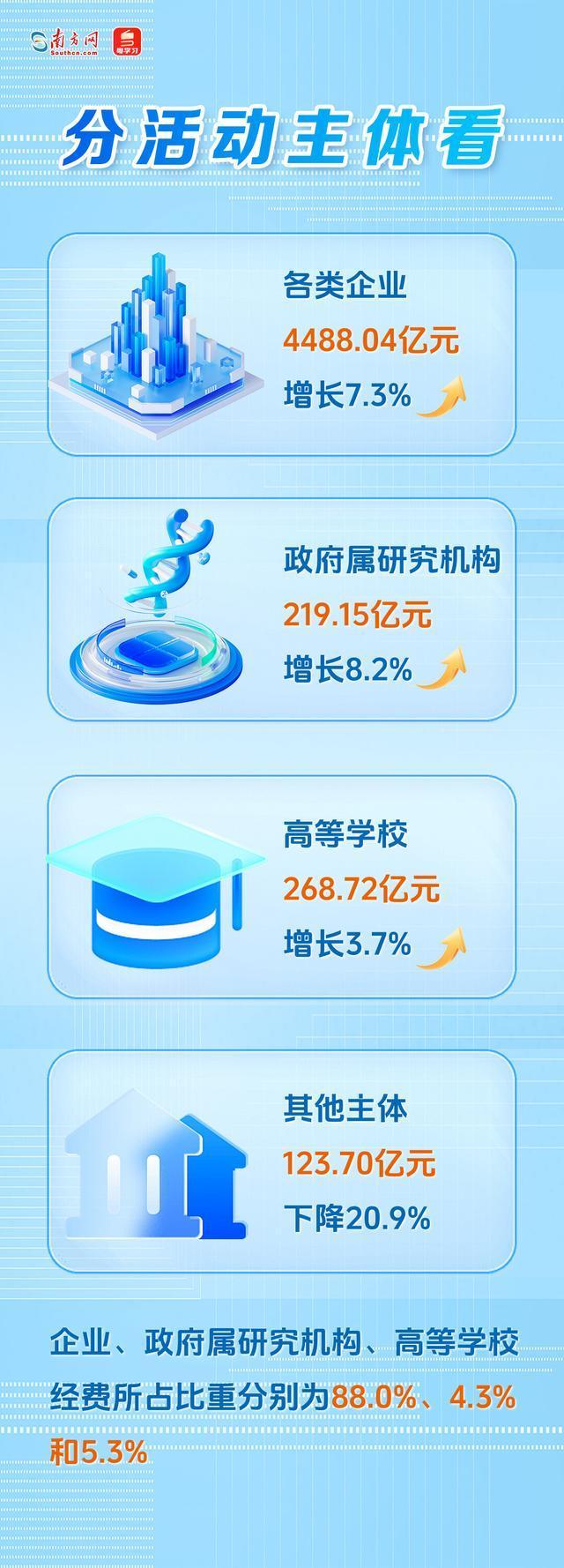 分活动主体看,广东各类企业研究与试验发展(R&D)经费4488.04亿元,比上年增长7.3%;政府属研究机构经费219.15亿元,增长8.2%;高等学校经费268.72亿元,增长3.7%;其他主体经费123.70亿元,下降20.9%。企业、政府属研究机构、高等学校经费所占比重分别为88.0%、4.3%和5.3%。