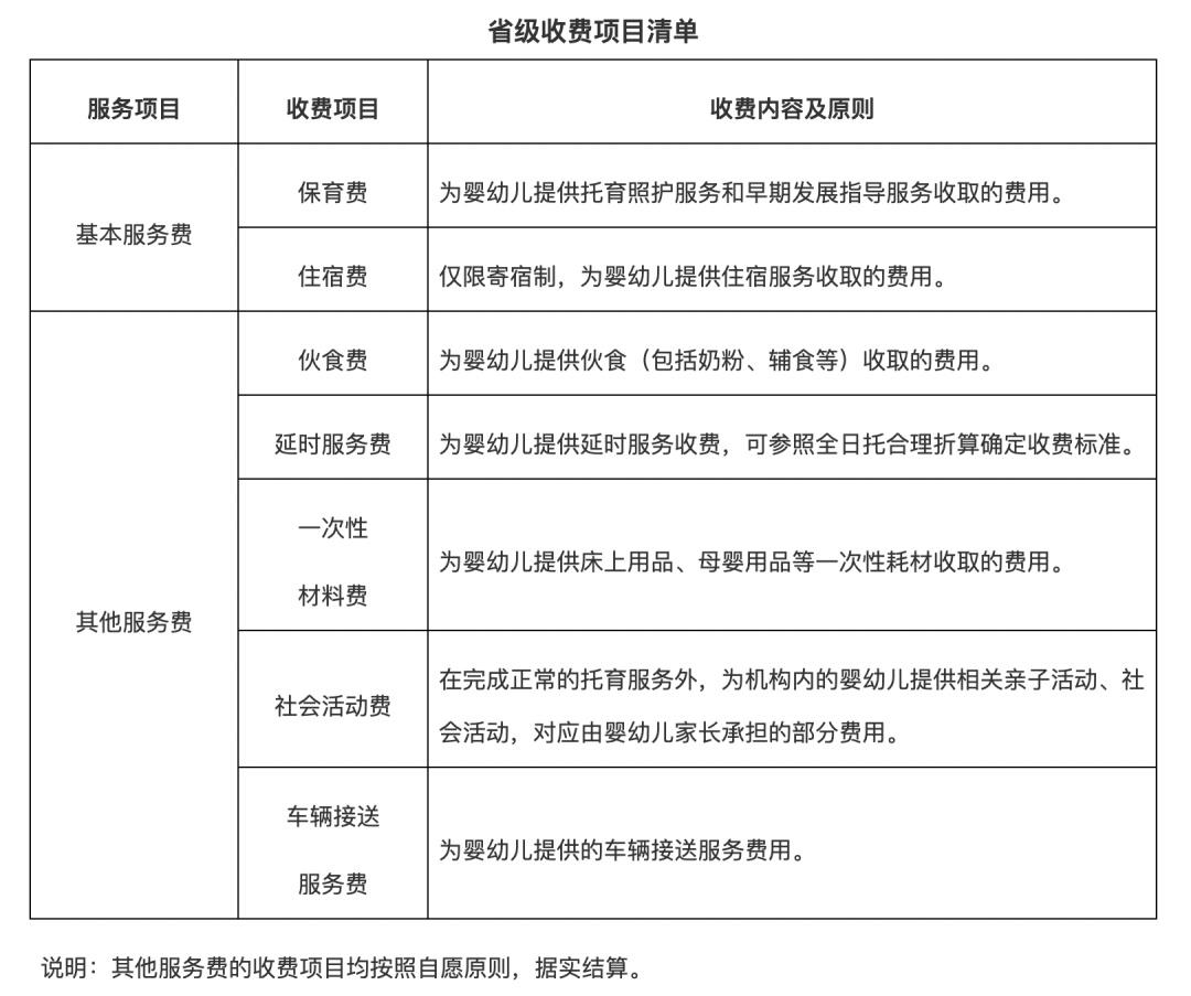 在收费方面,实行分类制定收费管理方式。普惠托育服务机构收费包括基本服务费和其他服务费。其中,基本服务费包括保育费、住宿费(仅限寄宿制);其他服务费指在基本服务费外,服务机构收取或代收的伙食费、材料费等其他费用。