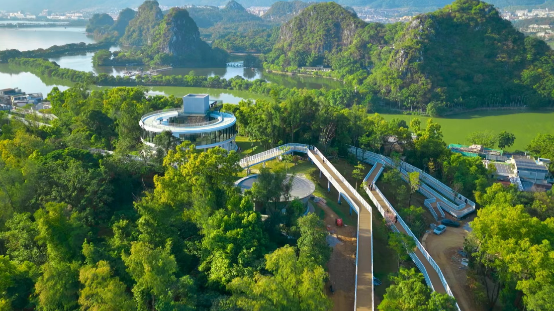 通过盘活山林资源,焕新的象岗成为“百千万工程”典型社区岩前社区的新地标,1314米的新建云道如飘逸丝带,有机串联山、湖、城、林。肇庆以绿美点建设撬动城乡蝶变,依托环星湖的生态优势,在岩前培育八十多家特色民宿,昔日城中村化身大湾区休闲旅游热门打卡地,实现生态修复与民生改善的双赢。