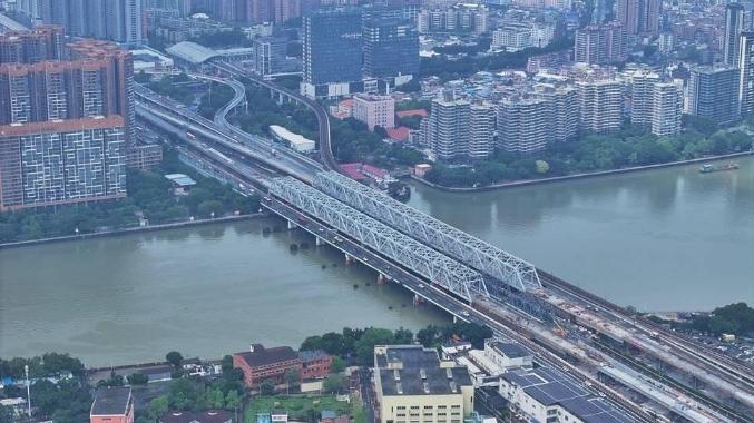 铁路桥珠江四线特大桥正线全长4.9公里,遵循“拆东保西、拆一建三”的设计原则,拆除原广茂铁路珠江东桥,保留原珠江西桥历史风貌,延续广茂铁路“双桥烟雨”风貌,将曾经的双线普速桥建设成四线高速铁路桥。