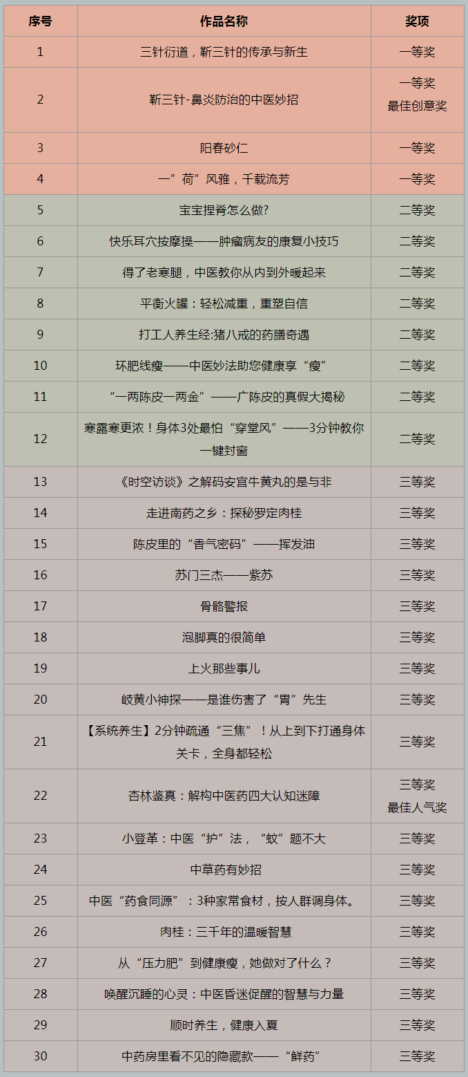 自2025年8月比赛启动以来,迅速点燃广大中医药爱好者的参与热情。活动期间,组委会累计收到全省中医药机构、院校、研究单位及个人报送的视频作品850份,经过规则性审查及意识形态审查筛选,最终452份作品入围线上展播环节。展播视频吸引了761.03万人次观看,共有163484人参与投票互动,总投票数超187万票。经过线下专家评审,共评选出30件获奖作品。其中,一等奖4项,二等奖8项,三等奖18项,最佳人气奖和最佳创意奖各1项。30件获奖作品将代表广东,被推荐至全国总决赛参与更高层级角逐,期待在全国舞台上绽放广东中医药科普风采!