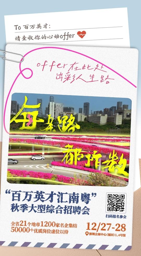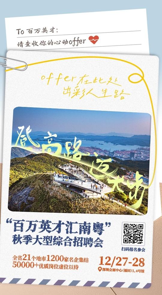 12月27日至28日,由人力资源社会保障部、教育部、广东省委、省政府联合主办,人力资源社会保障部全国人才流动中心、教育部学生服务与素质发展中心、广东省委人才办、省人力资源社会保障厅、省教育厅及深圳市委、市政府共同承办的 “百万英才汇南粤” 秋季大型综合招聘会,将在深圳会展中心(福田)盛大启幕。作为全省年末规模最大、规格最高、资源最集中的招才引智压轴大戏,本次招聘会汇聚粤港澳三地优质资源,超1200家重点用人单位现场揽才,提供超5万个优质岗位,其中众多岗位年薪达50万元以上,向海内外英才发出“双向奔赴”的最强邀约。