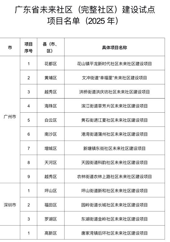 日前,省住房城乡建设厅在官网公布了省“百千万工程”指挥部城镇建设专班办公室印发的《广东省未来社区(完整社区)建设试点项目名单(2025年)》的通知,决定在70个社区开展未来社区(完整社区)建设试点,通过完善社区服务功能,补齐社区服务设施短板,增强人民群众的获得感、幸福感、安全感。通知要求,各地要加大财政投入力度,多渠道筹措资金,有力有序推进项目建设。