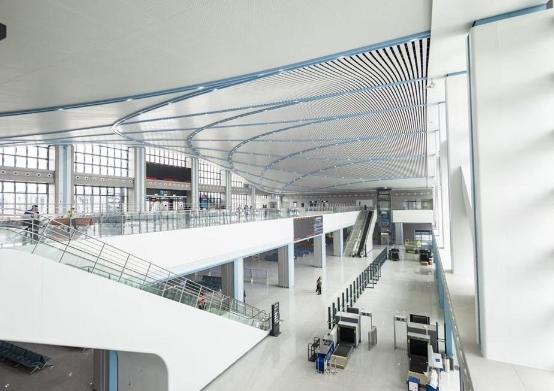 走进候车大厅,内装设计以“海映荔香,茂南华章”为文化主题,深度融合茂名地域特色。室内空间以浪花白为主色调,搭配深海蓝点缀,既体现了茂名与海洋紧密相连的地缘关系,又传递出空间的活力与生机。候车厅吊顶通过弧形交错设置形成独特编织纹理,既似日出光辉射线,又暗含渔网意象,呼应茂名“广东第一大渔港”的地域标签。柱子设计独具巧思,底部结合设备风道形成建筑基座,增添厚重感,细节处通过铝板转印呈现荔枝与日出光波组成的纹样,凸显文化底蕴。