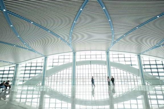 “茂名南站诠释了建筑与大海的共生。”施工单位中铁建设工程师邹龙兵介绍,为了将抽象的浪涛意象转化为坚实的建筑实体,项目团队创新采用“空间三角形管桁架”模块化工艺,实现大跨度钢结构“海浪形态”的精准拼装。外立面飘带通过多曲面安装工艺,展现海浪翻滚的态势。大厅吊顶采用横向条板,营造海浪层叠效果,弧形吊顶的标高做了渐变处理,拉伸了空间的纵深感,瞬间给人以舒展感。