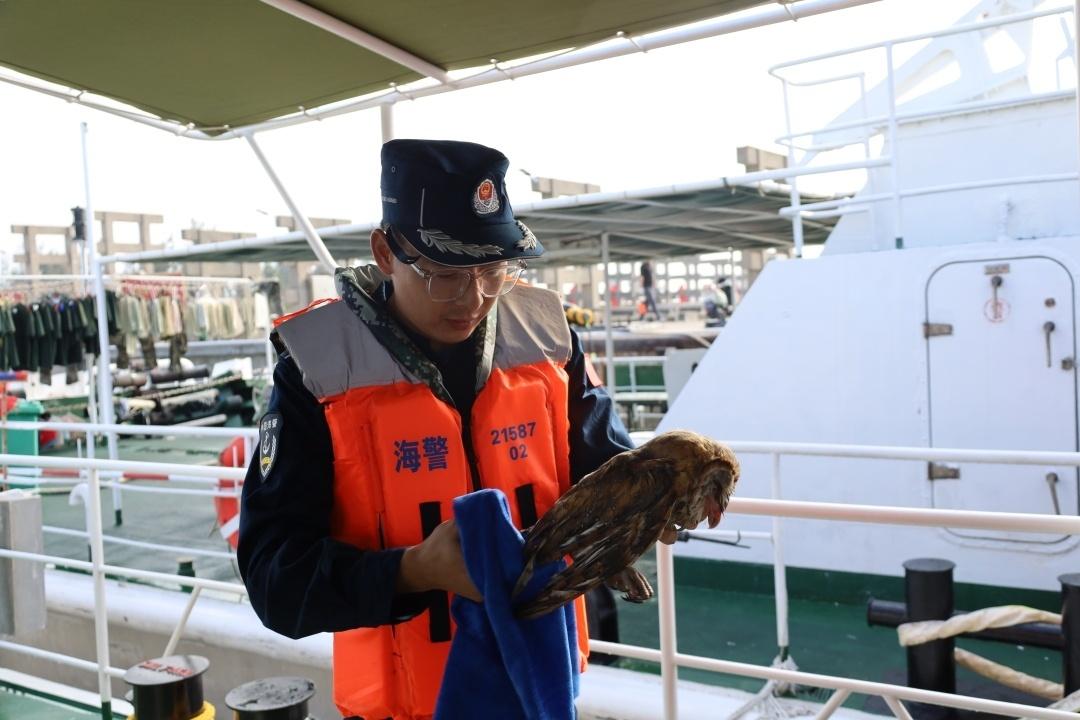 记者12月20日从广东海警局获悉,近日,茂名海警局横沥艇在水东湾大桥水域成功救助一只受伤的国家二级保护动物草鸮(猫头鹰)。