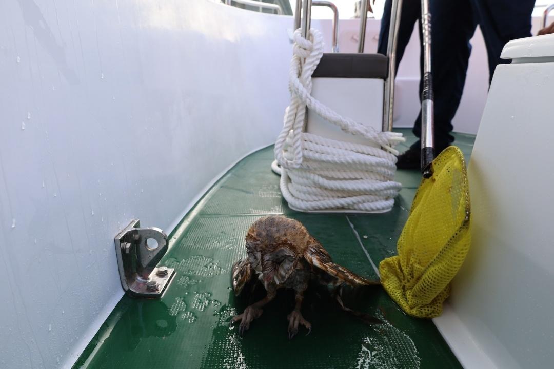 抵达目标海域后,执法员发现一只疑似猫头鹰的鸟类坠入海中,正蜷缩在桥墩防撞垫间隙中,羽毛被海水浸湿,无法正常飞行。由于事发海域风浪渐起,若不及时救助,该动物恐有溺亡风险。执法员当机立断,平缓靠近,凭借丰富的救援处置经验,使用抄网将其平稳转移至快艇安全区域并立即返航。