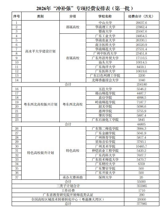 据公示消息,为加快构建自强卓越的高等教育体系,不断提升高校对高质量发展的支撑力、贡献力,结合各高校建设情况,广东省教育厅研究制定了2026年高等教育“冲一流、补短板、强特色”专项资金安排方案(第一批,详见附表)。现根据《广东省省级财政专项资金管理办法(2025年修订)》(粤府〔2025〕56号)的有关规定,对经费安排予以公示,公示期自2025年12月24日至2025年12月31日,共7天。