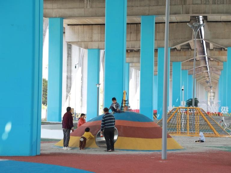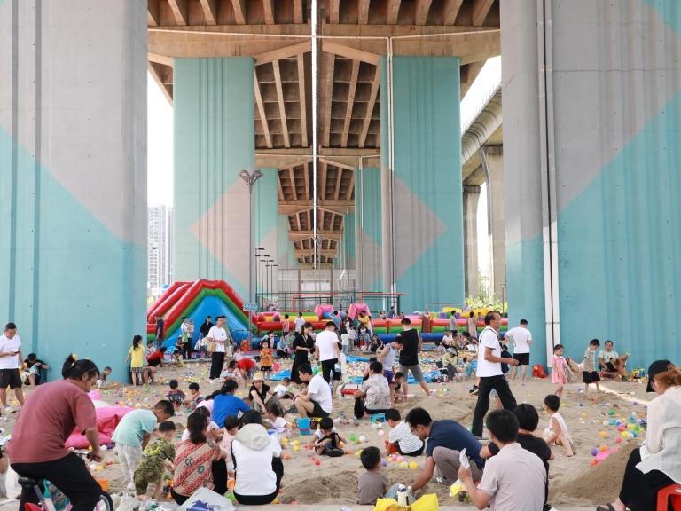 桥底变身色彩斑斓的游乐场,孩子们在家长陪伴下欢乐嬉戏。