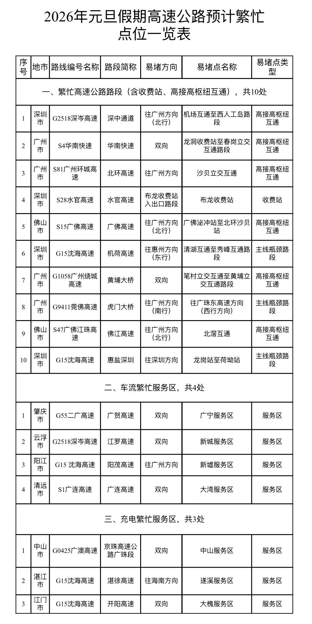 经与省公安厅交管局联合研判,2026年广东省元旦假期较为拥堵的路段、收费站、车流较饱和的服务区以及充电设施利用率高的服务区详见附表,繁忙高速公路路段包括深中通道、华南快速、北环高速、水官高速、广佛高速、黄埔大桥、虎门大桥等。