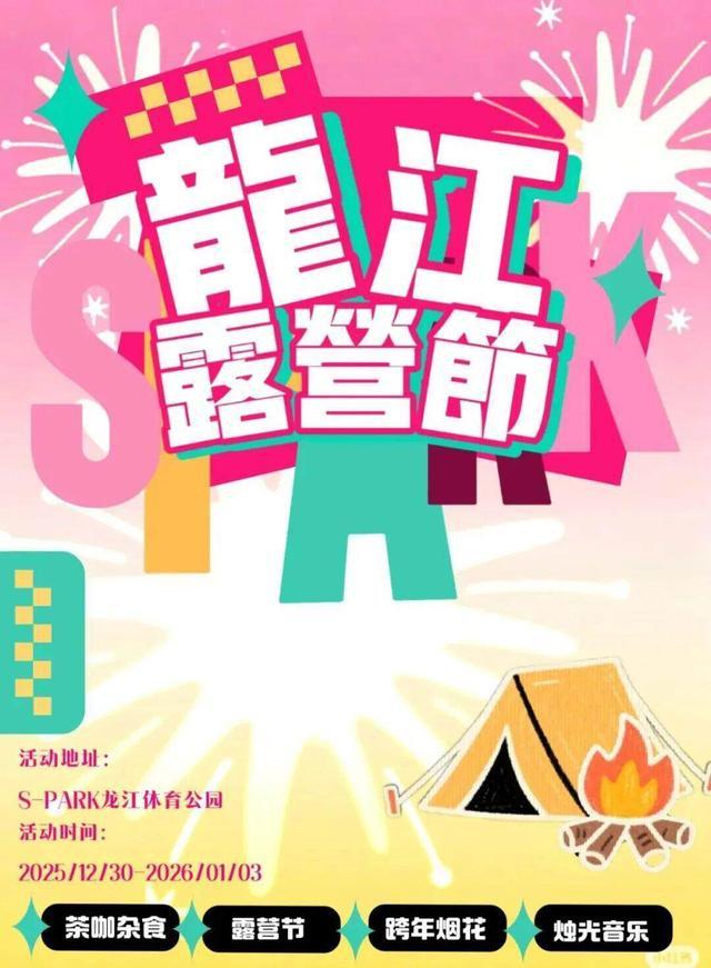 龙江镇首次推出的“龙江露营节”将于2025年12月30日至2026年1月3日,在龙江S-park体育公园持续举办。活动融合特色咖啡、本土美食、农家乐体验与娱乐设施,并安排乐队表演,旨在打造一个集休闲、餐饮、娱乐于一体的户外假日社交新空间,为市民提供放松身心、欢聚迎新的多元化选择。