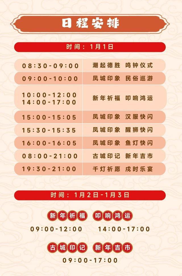 活动将持续三天、全天沉浸式剧情演绎;威武春使骑士策马入城献词;新年鸣钟,亲手鸣响新元;非遗民俗大巡游;电子孔明灯营造星空浪漫,民乐团专场新年音乐会。其中,互动、巡游、鸣钟活动免费,电子孔明灯和新年音乐会是公益售票。