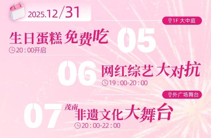 茂南万达广场也有精彩跨年活动奉上。生日蛋糕免费吃!网红综艺大对抗!醒狮、茂南洪拳、鳌鱼舞、灯笼舞……各种非遗表演轮番上演,玩转你的跨年夜——