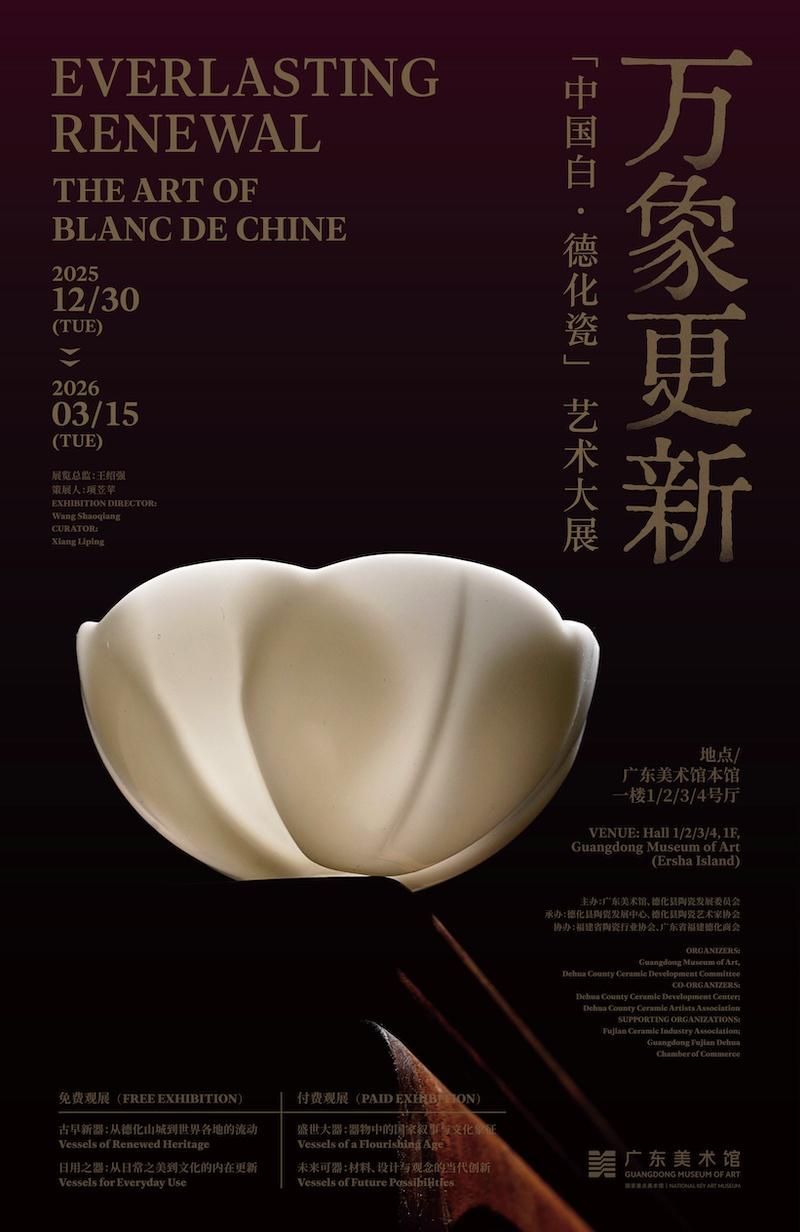简介:德化瓷素有“中国白”之誉,其“白”不仅是色彩,更承载着清净、澄明、简淡的中国美学理想。将德化瓷带到广州这一海上丝绸之路的重要节点,既是追溯古代贸易与文明交流的轨迹,也是在当代国际视野中重新审视“中国白”的意义。展览关注德化瓷如何在时代变迁中,通过持续的自我更新展现文化本色。