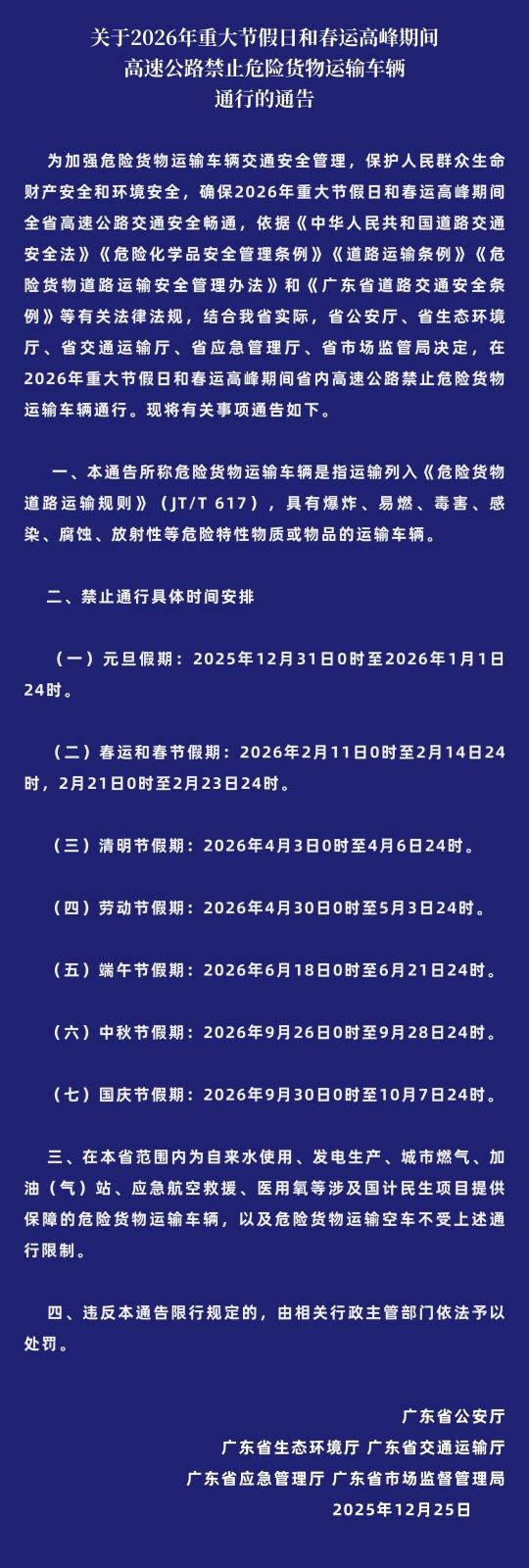 记者获悉,为加强危险货物运输车辆交通安全管理,保护人民群众生命财产安全和环境安全,确保2026年重大节假日和春运高峰期间全省高速公路交通安全畅通,依据《中华人民共和国道路交通安全法》《危险化学品安全管理条例》等有关法律法规,广东省公安厅、省生态环境厅、省交通运输厅、省应急管理厅、省市场监管局决定,在2026年重大节假日和春运高峰期间省内高速公路禁止危险货物运输车辆通行。