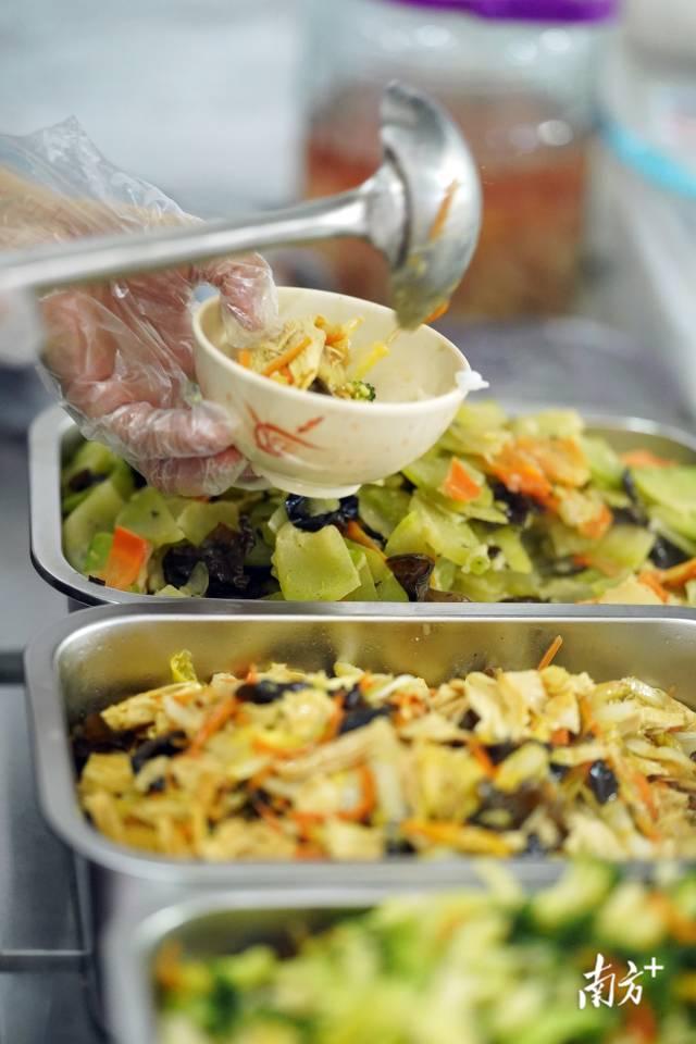 腐竹木耳蒸米粉、西红柿炒蛋、蒜蓉菜心……食堂提供的虽然都是家常菜,但新鲜现做,每天换着花样来,有时还搭配煲汤。