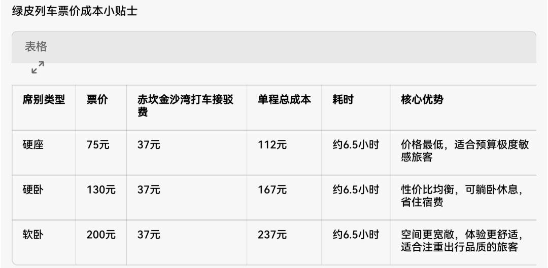 4. 绿皮硬座:打车接驳37元 + 硬座75元 = 112元,耗时约6.5小时