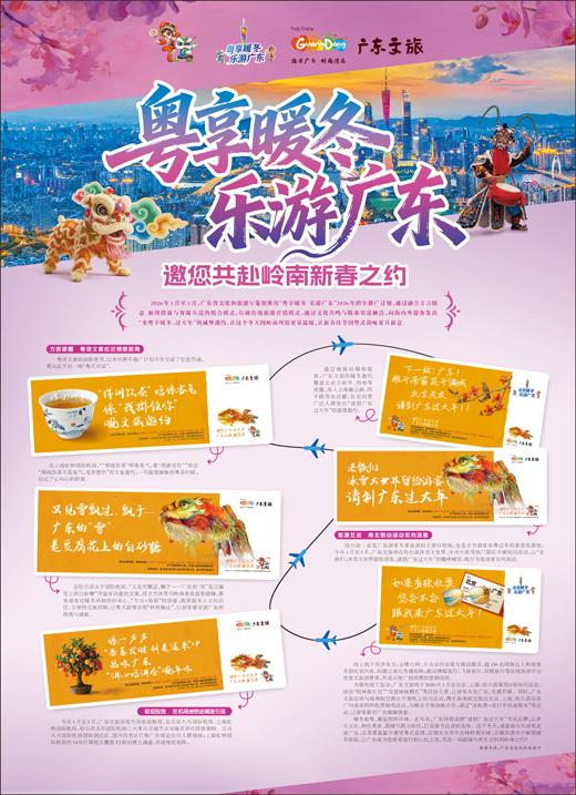2026年1月至3月,广东省文化和旅游厅策划推出“粤享暖冬 乐游广东”2026年跨年推广计划,通过融合方言创意、枢纽投放与客源互送的组合模式,打破传统旅游营销模式,通过文化共鸣与精准渠道触达,向海内外游客发出“来粤享暖冬,过大年”的诚挚邀约,让这个冬天因岭南风情更显温暖,让新春佳节因粤式韵味更具新意。