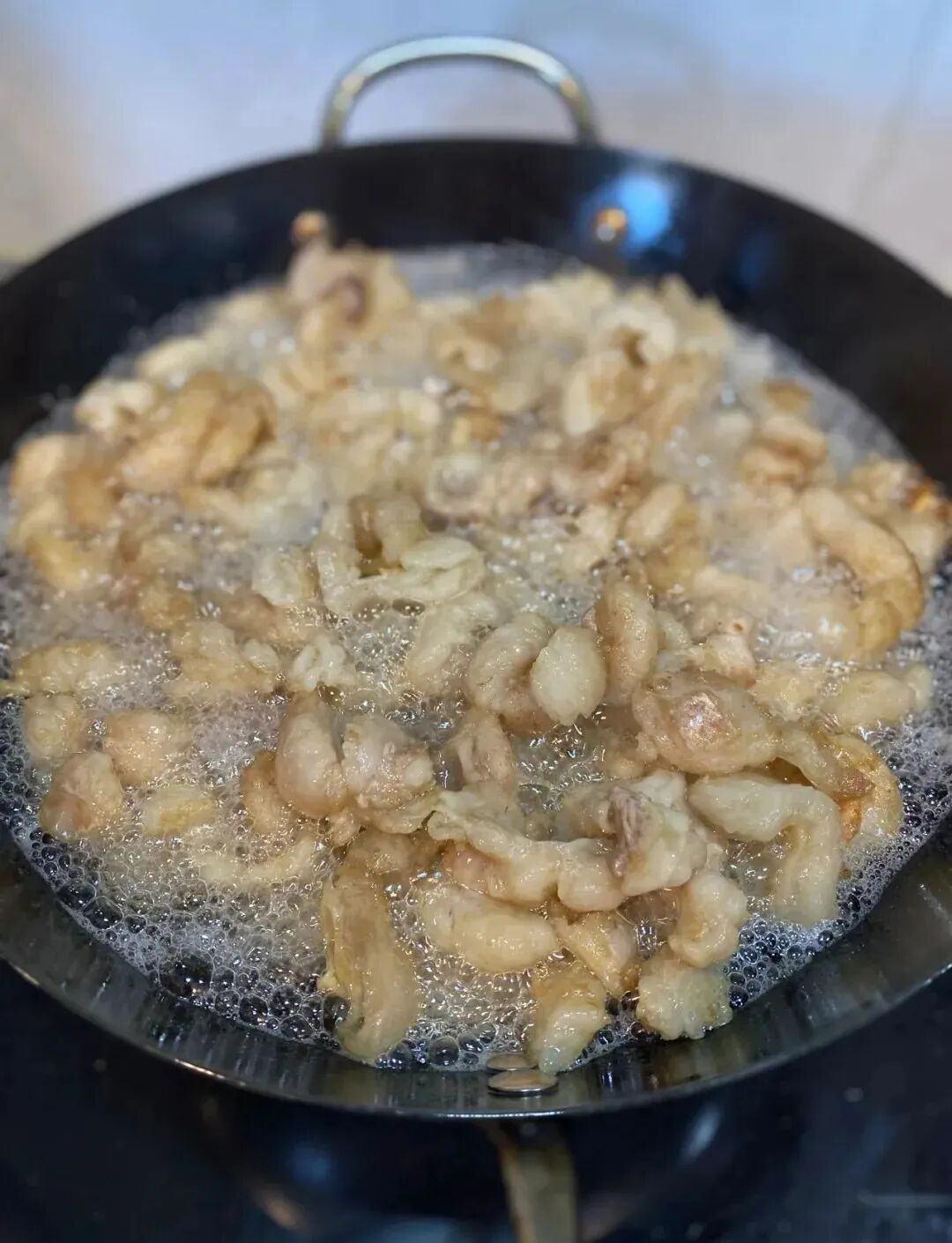 而猪油渣是在炼制猪油过程中产生的副产品。当猪板油中的油脂被充分炼出后,剩下的就是猪油渣。这些油渣富含蛋白质和不饱和脂肪,经过高温加热,质地变得酥脆,散发出诱人的焦香味,吃上一口,那心情简直跟过年一样高兴。