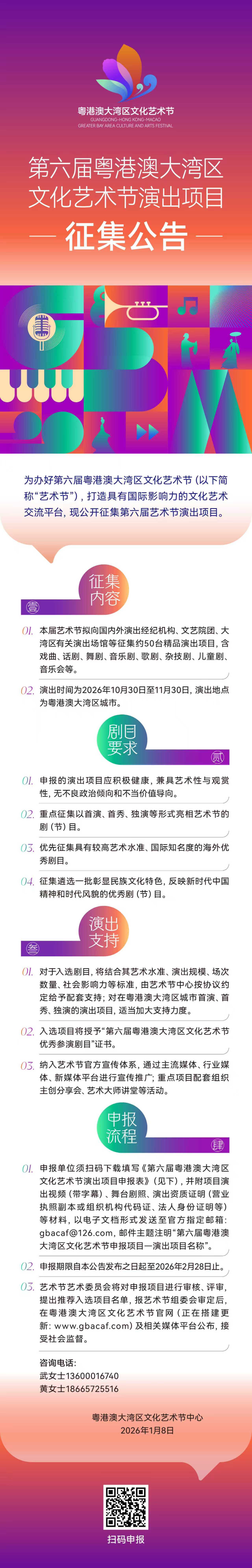 1月8日,第六届粤港澳大湾区文化艺术节正式启动演出项目全球征集,一场汇聚多元艺术的湾区文艺盛宴即将启幕。