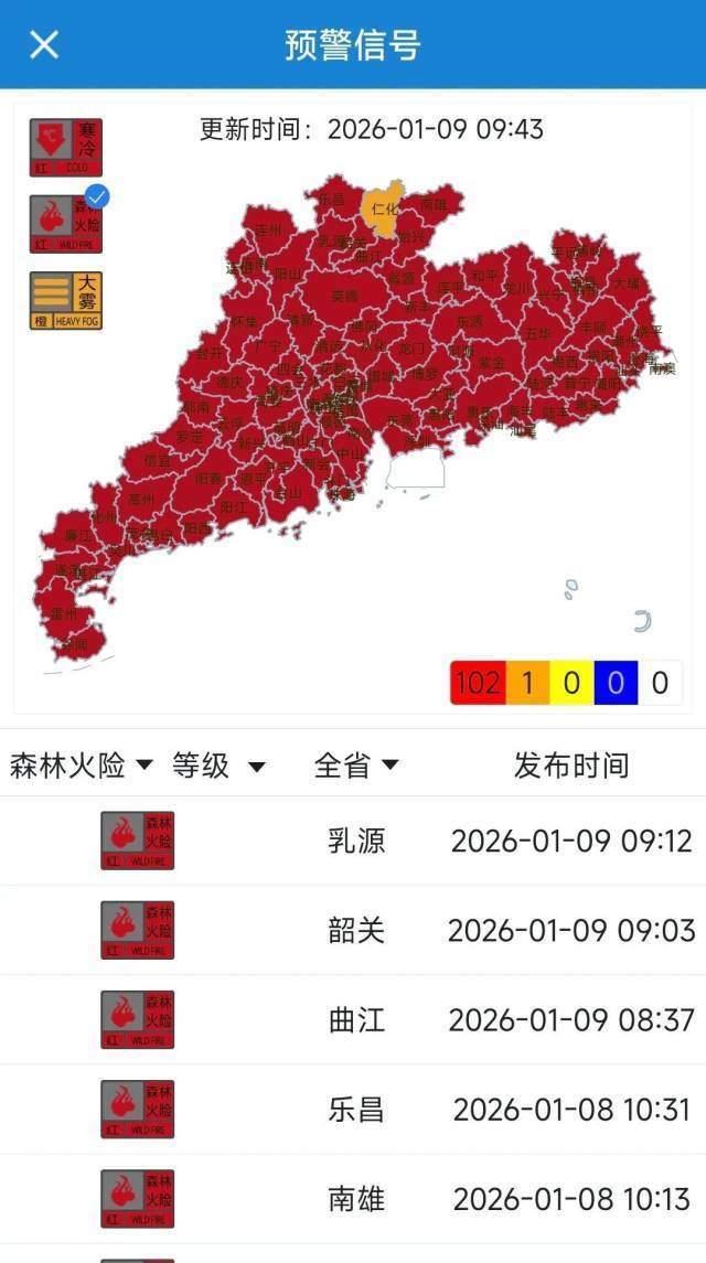 1月9日,笔者从广东省应急管理厅获悉,截至9日9点43分,全省102个森林火险红色预警信号生效中,广州、深圳、珠海、汕头、佛山、韶关、河源、梅州、惠州、汕尾、东莞、中山、江门、阳江、湛江、茂名、肇庆、清远、潮州、揭阳、云浮部分地区森林火险等级为高度危险(五级),韶关部分地区森林火险等级为高度危险(四级)。