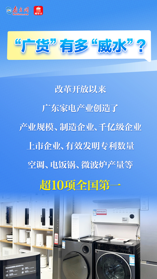从20世纪80年代开始,广货便开始风靡全国,如今已持续畅销全球超过40余年。从珠江水、广东粮、岭南衣、粤家电,到如今的机器人、无人机、新能源汽车、AI眼镜,一组数据足以说明广货的爆款之多:跨境电商进出口规模9年扩大66倍,在全国占比超过1/3,规模稳居全国第一;全国每产生4件快递,就有1件来自广东;全球每卖出3台手机,就有1台来自广东;大疆占据全球消费级无人机70%以上市场份额……