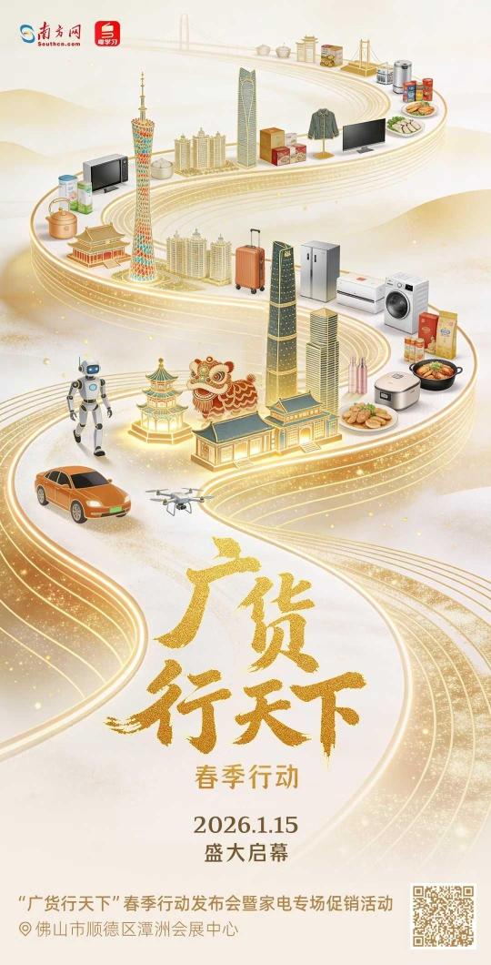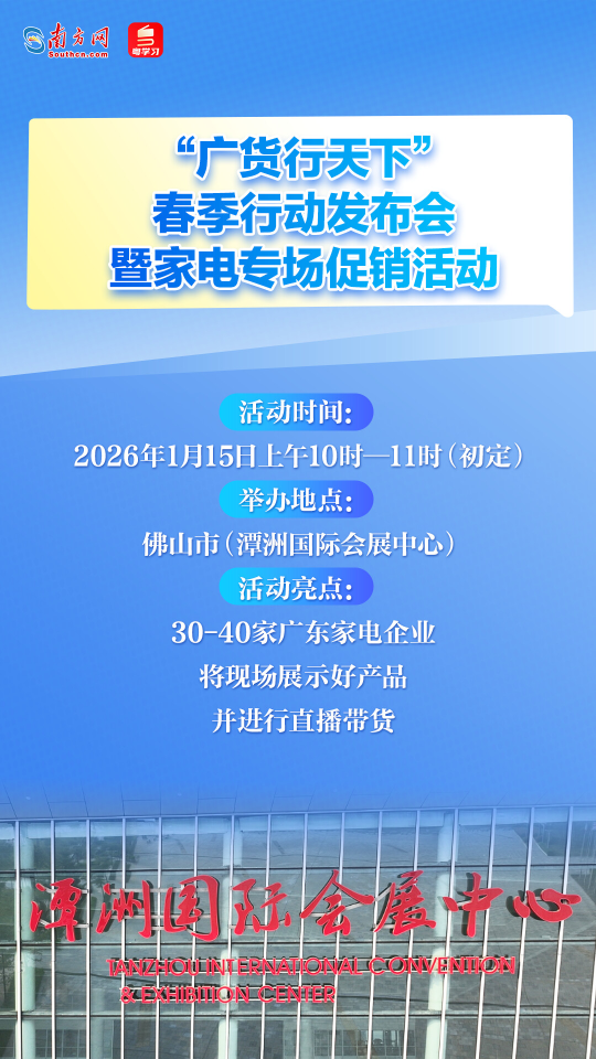 为贯彻落实省委十三届八次全会暨省委经济工作会议部署要求,助力企业拓市场、促销售,“广货行天下”春季行动发布会暨家电专场促销活动将于1月15日在佛山举行,正式拉开2026年度广东产品线上促销活动的序幕。