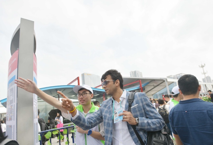 2019年志愿者为前来参加广交会的国外采购商提供咨询服务。