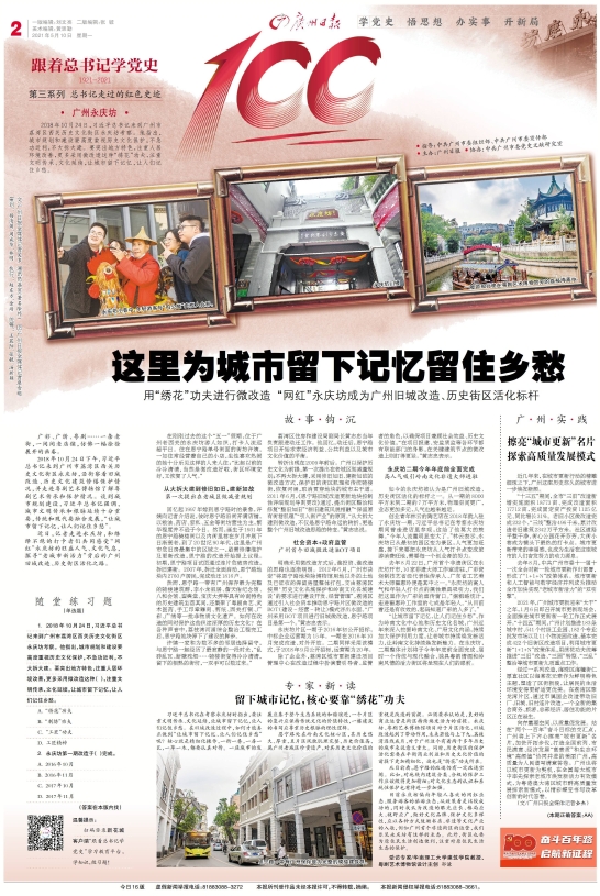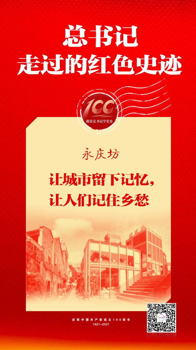 2018年10月24日,习近平总书记来到广州市荔湾区西关历史文化街区永庆坊考察。他指出,城市规划和建设要高度重视历史文化保护,不急功近利,不大拆大建。要突出地方特色,注重人居环境改善,更多采用微改造这种“绣花”功夫,注重文明传承、文化延续,让城市留下记忆,让人们记住乡愁。